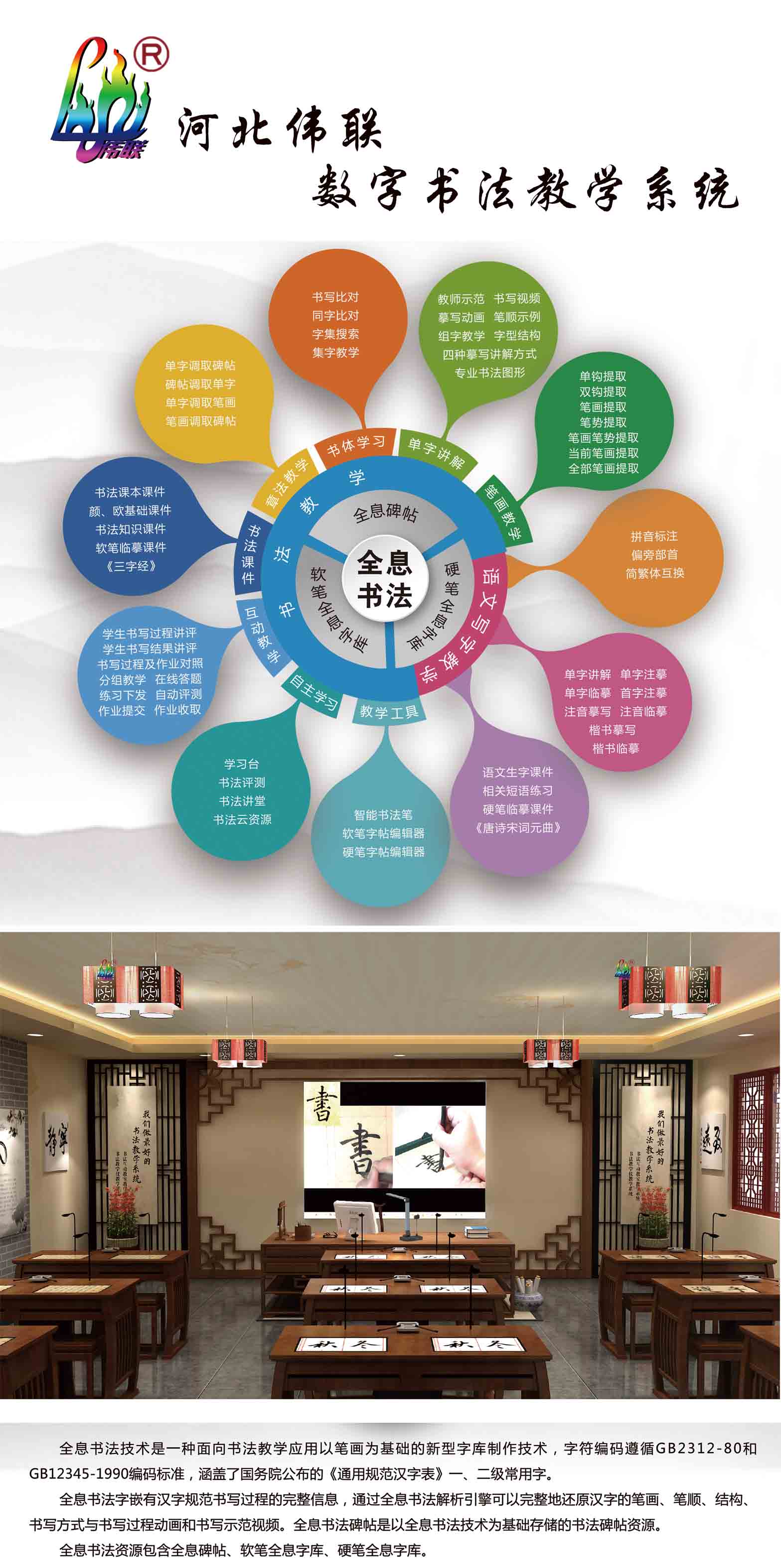 河北偉聯(lián)教學(xué)儀器設(shè)備有限公司開拓的數(shù)字化書法教室,涵蓋了全息書法下的“全息碑貼”、“硬筆全息字庫(kù)”、“軟筆全息字庫(kù)”,以“書法教學(xué)”和“語(yǔ)文寫字教學(xué)”為基礎(chǔ),字符編碼遵循GB2312-80和GB12345-1990編碼標(biāo)準(zhǔn),通過(guò)全息書法解析引擎可以完整地還原漢字的筆畫、筆順、結(jié)構(gòu)、書寫方式與書寫過(guò)程動(dòng)畫和書寫示范視頻。