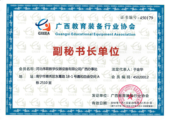 2018年1月18日,河北偉聯(lián)教學儀器設備有限公司廣西辦事處正式入會廣西教育裝備行業(yè)協(xié)會,并榮獲《廣西教育裝備行業(yè)協(xié)會副秘書長單位》證書。